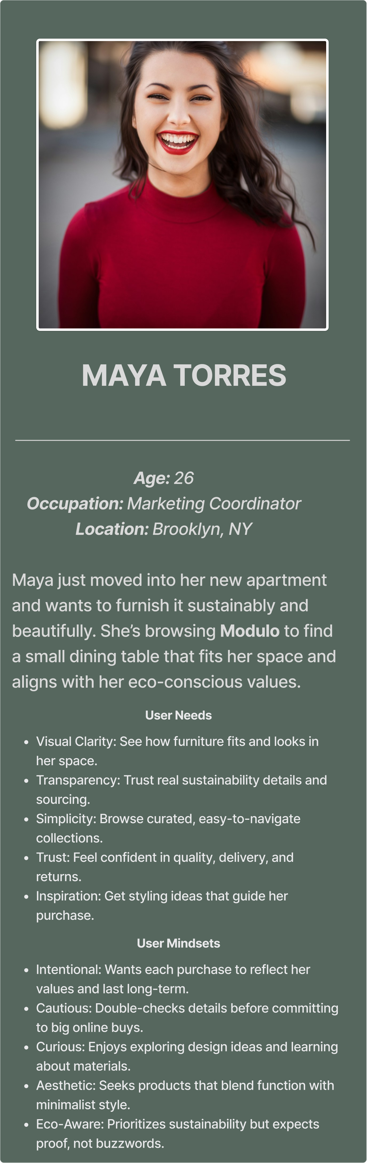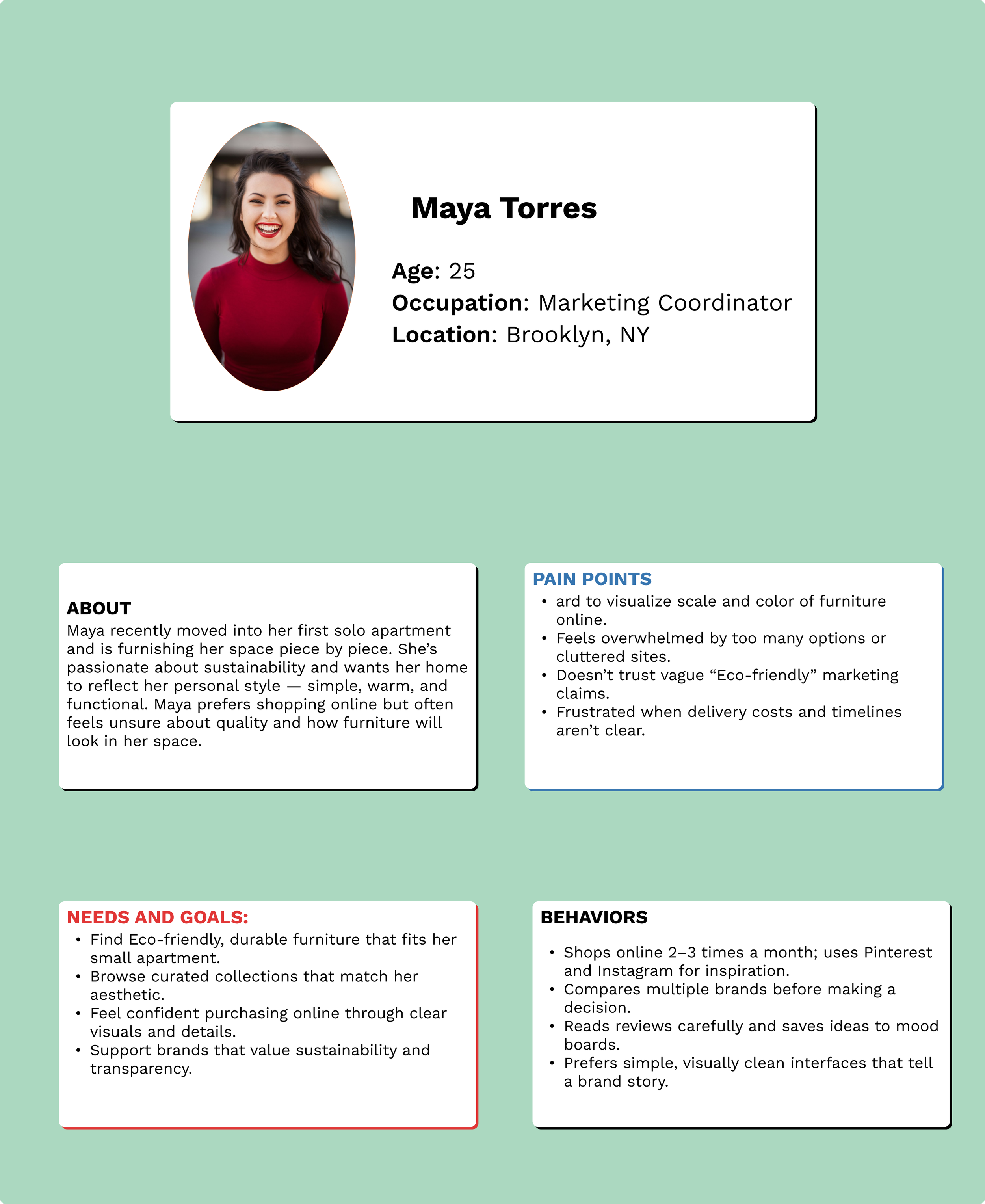 Maya (26, conscious renter): Wanted curated selections and clear sustainability details.