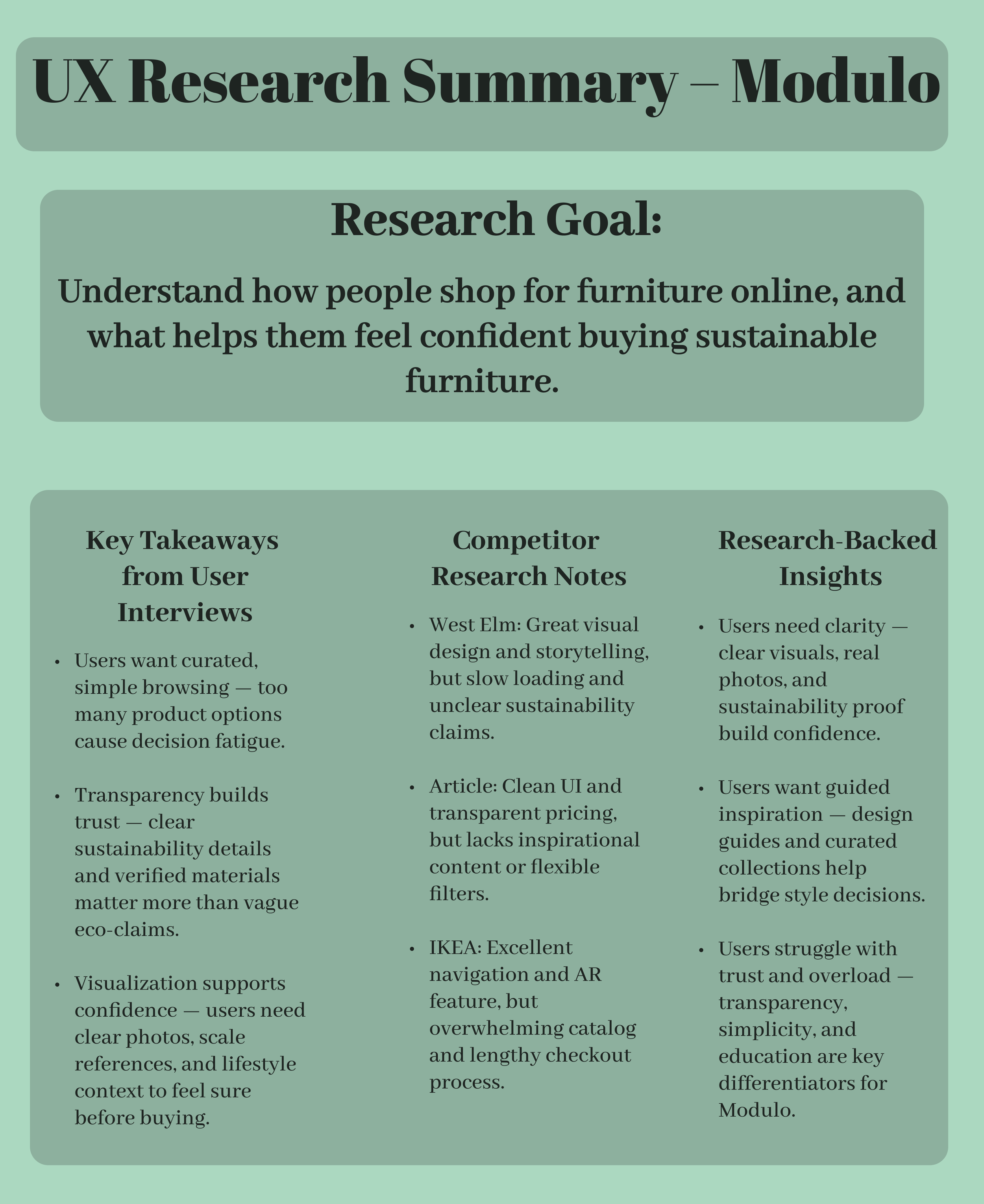 Through research, I found that users were struggling to feel confident buying sustainable furniture online — they couldn’t visualize how pieces would fit in their space, trust brand claims, or navigate cluttered layouts.